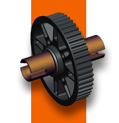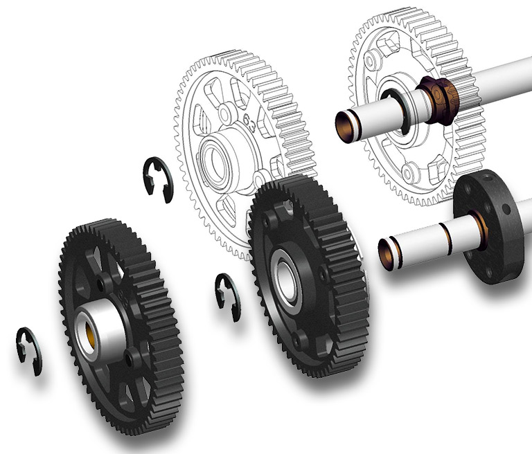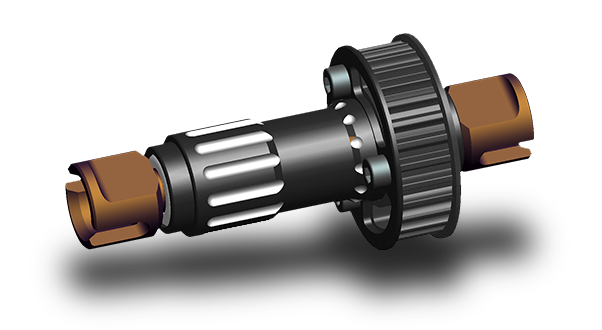 The narrow, solid rear axle in Serpent spring steel features a lightweight 48T, 9mm wide pulley. The CVD-type spring steel drive shafts connect the rear axle to the hard-coated aluminum wheel axles, which are equipped with aluminum quick-change levers. This results in a highly durable and long-lasting drivetrain.