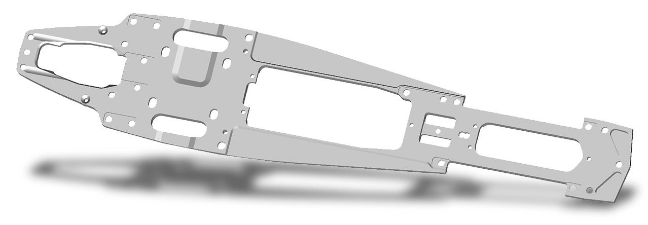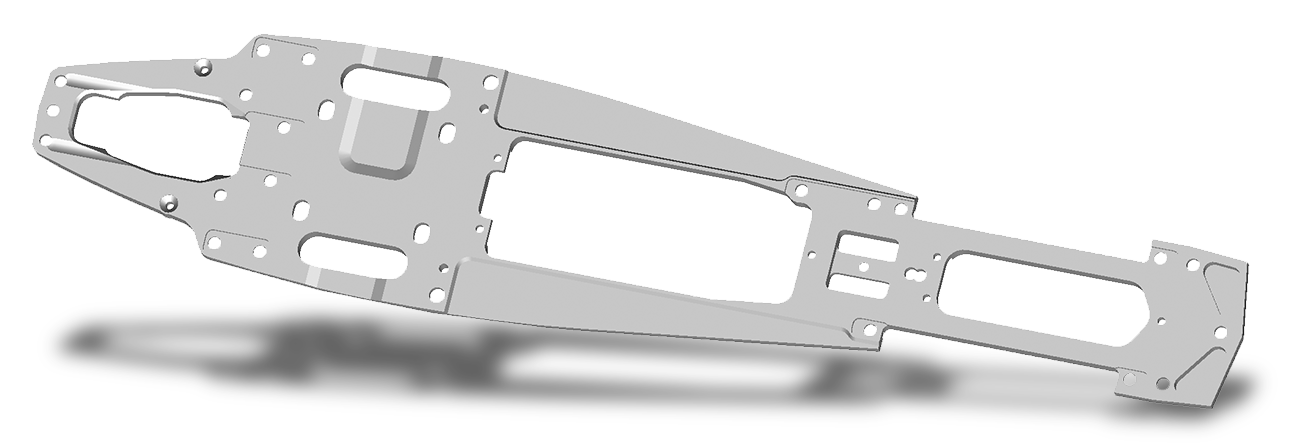 7075 T6 Aluminium 5mm chassis plate. The 5mm aluminum chassis features a perfectly symmetrical shape for balanced flex and even weight distribution. Its ultra-narrow design keeps it exceptionally lightweight, while still maintaining strength in critical areas for durability and performance.