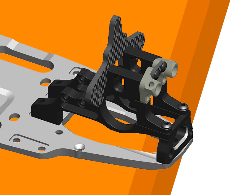 The rear floating body mount which is mounted on the up-rights with 2 arms is centred by a carbon-fibre and steel guider. The mount has 4 positions on each side to choose from, depending on body shell used and traction available. The threaded holes on the end of the body mount give the option to add further body-supports.